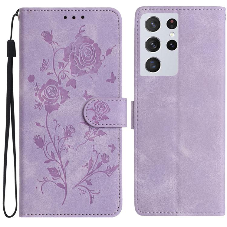 For Samsung Galaxy S21 Ultra 5G Rose Flower Embossing Pattern Leather Phone Case(Light Purple)