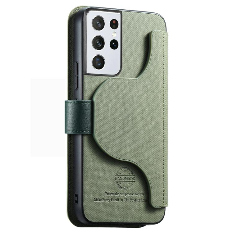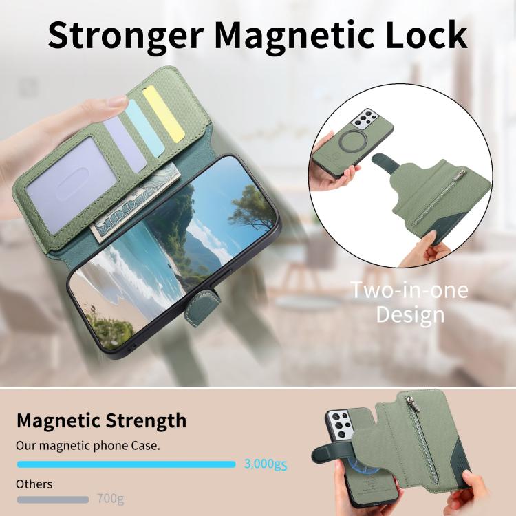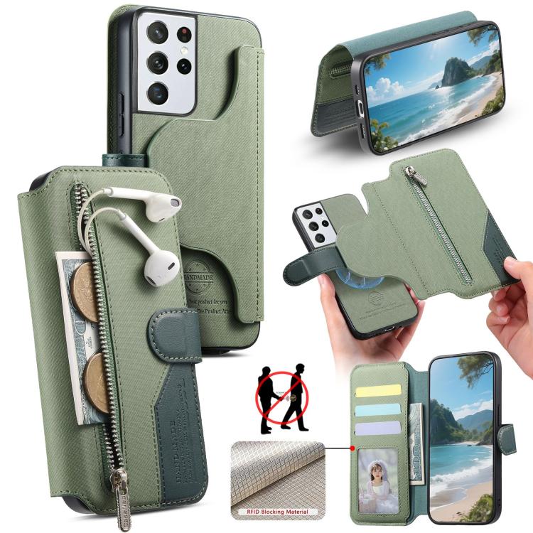 For Samsung Galaxy S21 Ultra 5G Twill Fabric MagSafe RFID Anti-theft Zipper Wallet Leather Phone Case(Green)