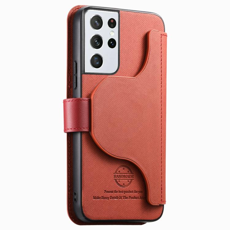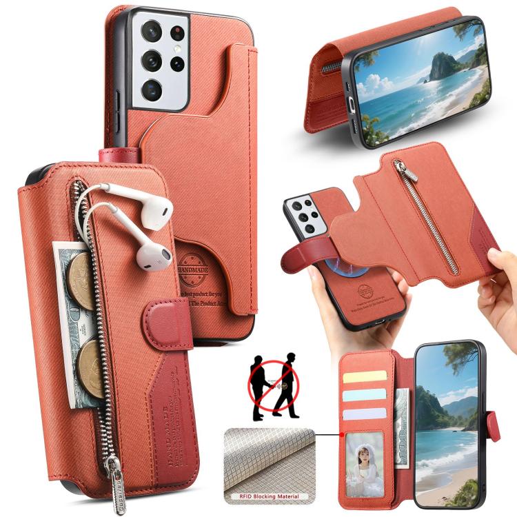 For Samsung Galaxy S21 Ultra 5G Twill Fabric MagSafe RFID Anti-theft Zipper Wallet Leather Phone Case(Orange)
