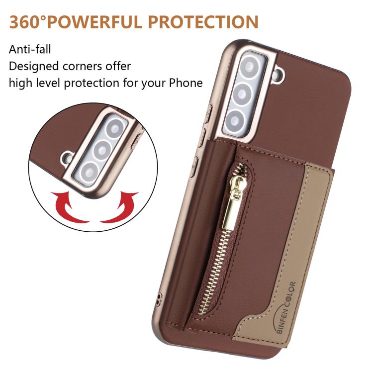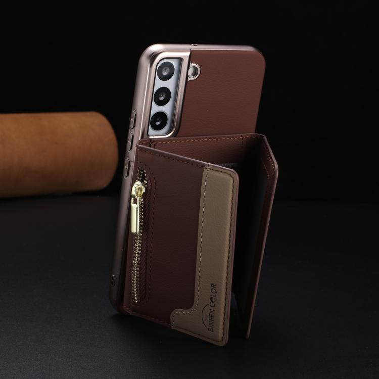 For Samsung Galaxy S22+ 5G Zipper Horizontal Magnetic Card Bag RFID MagSafe Phone Case(Brown)