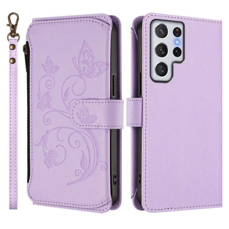 For Samsung Galaxy S22 Ultra 5G Butterfly Love Flower Multi-card Zipper Wallet Leather Phone Case(Light Purple)