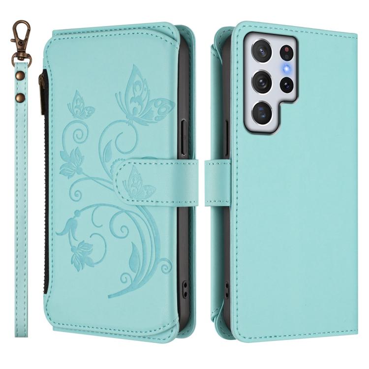 For Samsung Galaxy S22 Ultra 5G Butterfly Love Flower Multi-card Zipper Wallet Leather Phone Case(Mint Green)