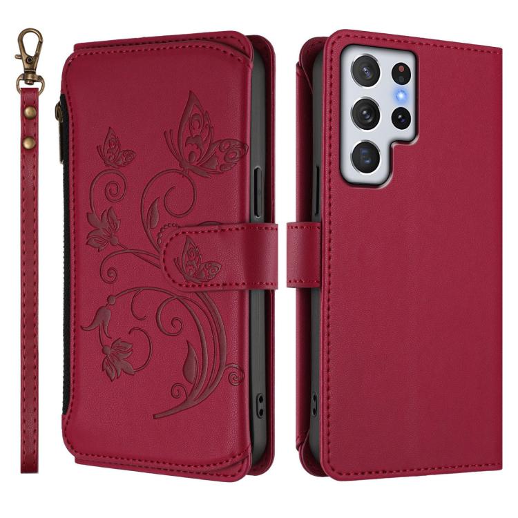 For Samsung Galaxy S22 Ultra 5G Butterfly Love Flower Multi-card Zipper Wallet Leather Phone Case(Wine Red)