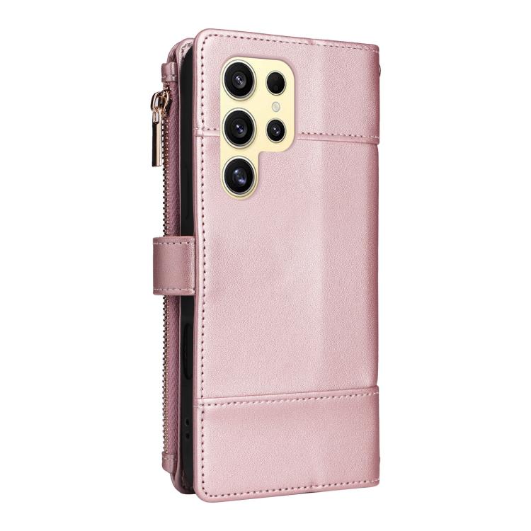 For Samsung Galaxy S22 Ultra 5G Crossbody Strap RFID Blocking Zipper Wallet Leather Phone Case(Rose Gold)