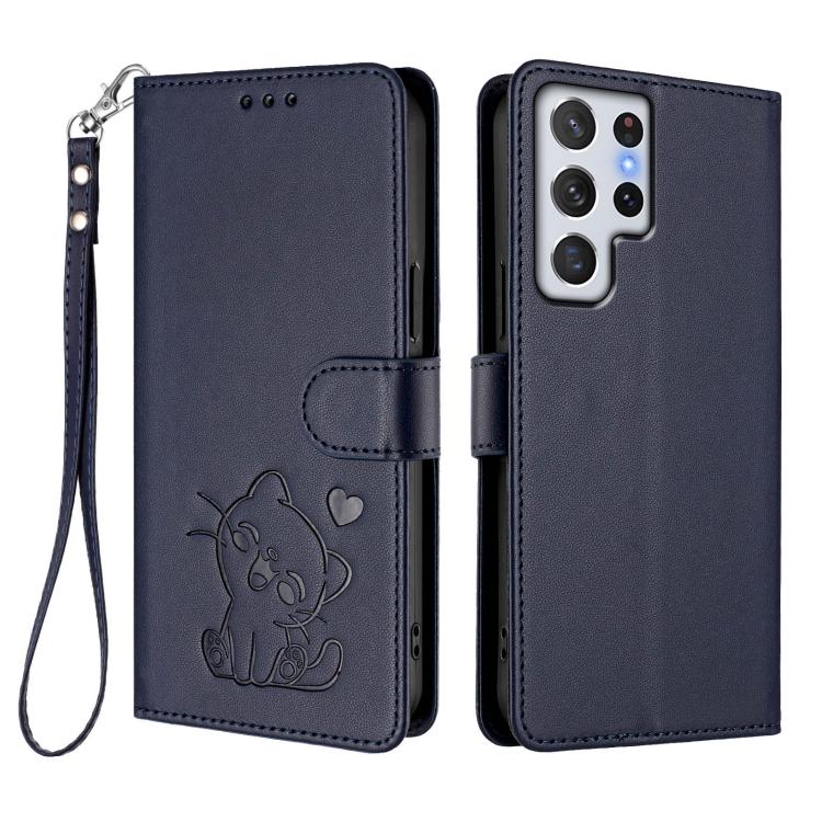 For Samsung Galaxy S22 Ultra 5G Embossed Heart Cat Leather Phone Case with Hand Strap(Blue)