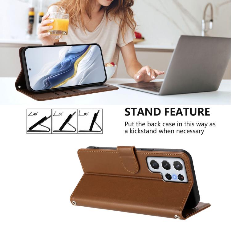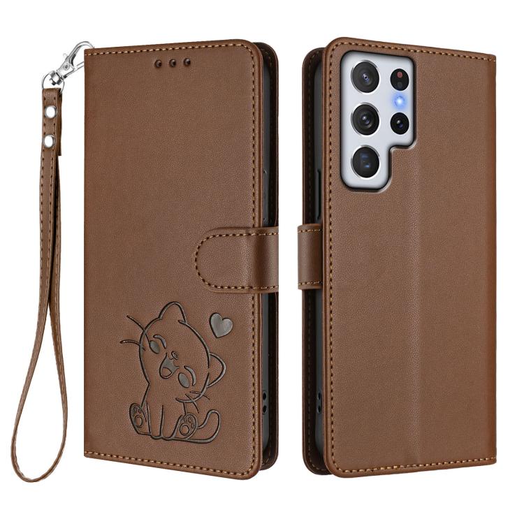 For Samsung Galaxy S22 Ultra 5G Embossed Heart Cat Leather Phone Case with Hand Strap(Brown)