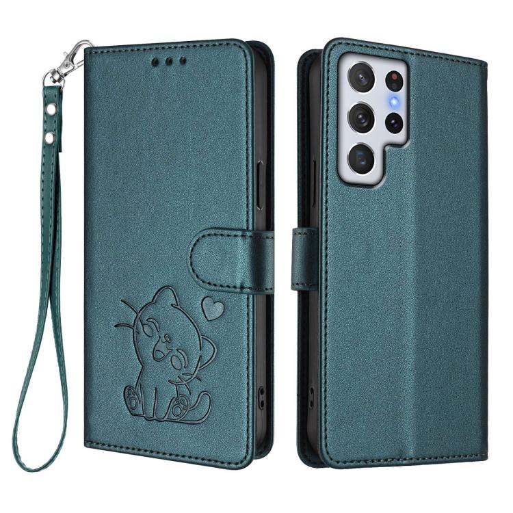 For Samsung Galaxy S22 Ultra 5G Embossed Heart Cat Leather Phone Case with Hand Strap(Dark Green)