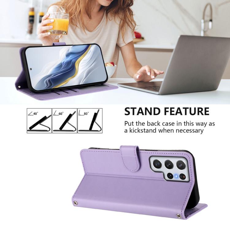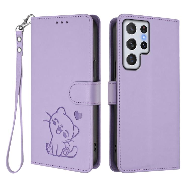 For Samsung Galaxy S22 Ultra 5G Embossed Heart Cat Leather Phone Case with Hand Strap(Light Purple)