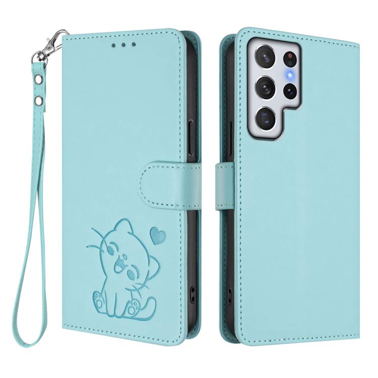 For Samsung Galaxy S22 Ultra 5G Embossed Heart Cat Leather Phone Case with Hand Strap(Mint Green)