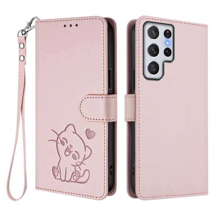 For Samsung Galaxy S22 Ultra 5G Embossed Heart Cat Leather Phone Case with Hand Strap(Pink)