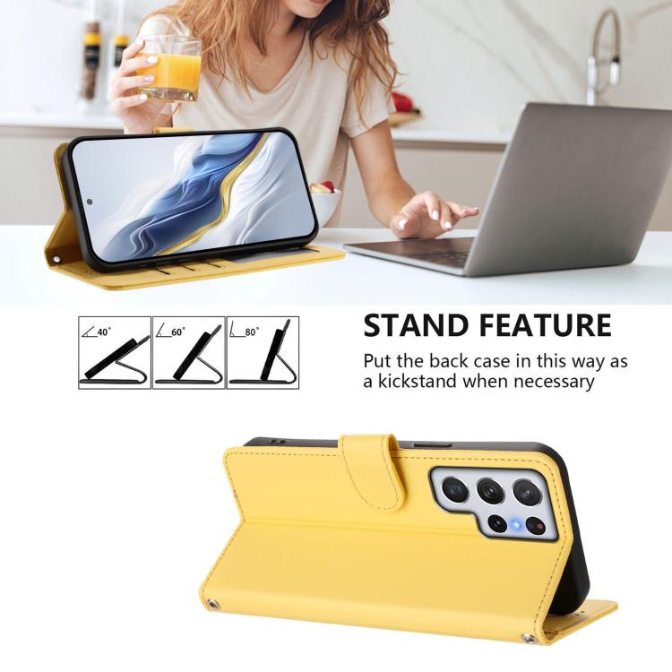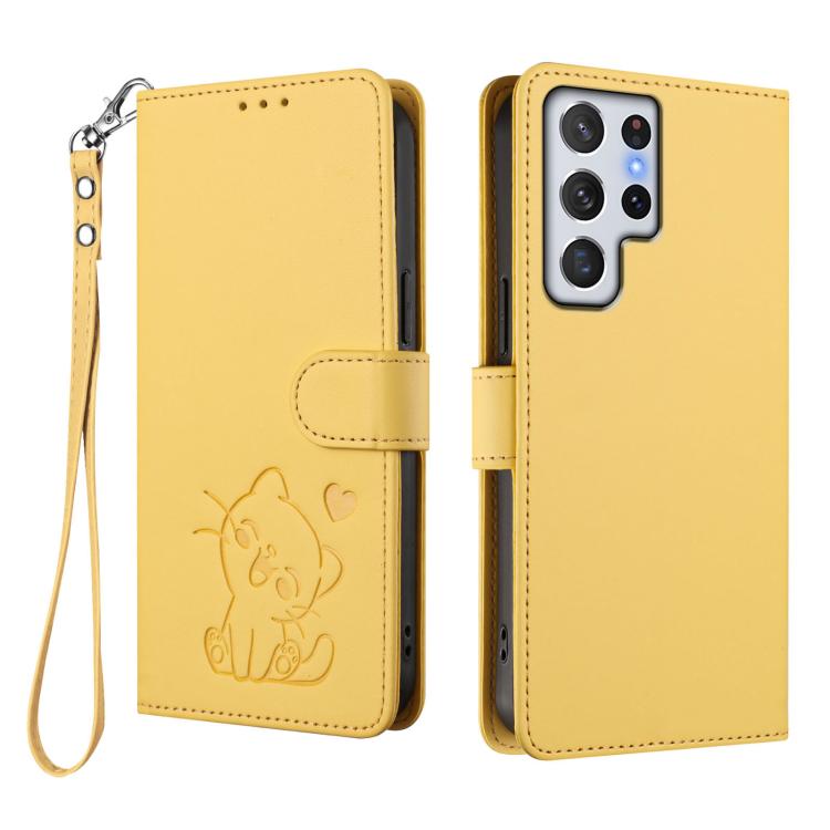 For Samsung Galaxy S22 Ultra 5G Embossed Heart Cat Leather Phone Case with Hand Strap(Yellow)