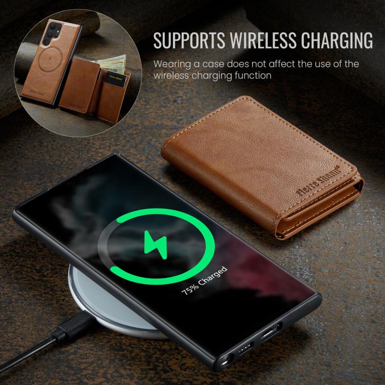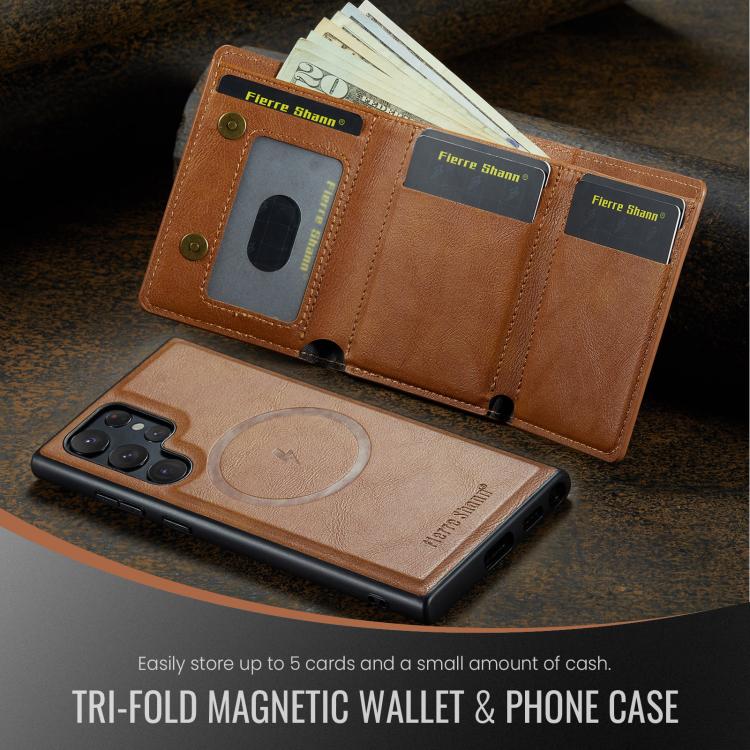 For Samsung Galaxy S22 Ultra 5G Fierre Shann 2 in 1 Holder RFID Card Slot Wallet MagSafe Phone Case(Dark Brown)