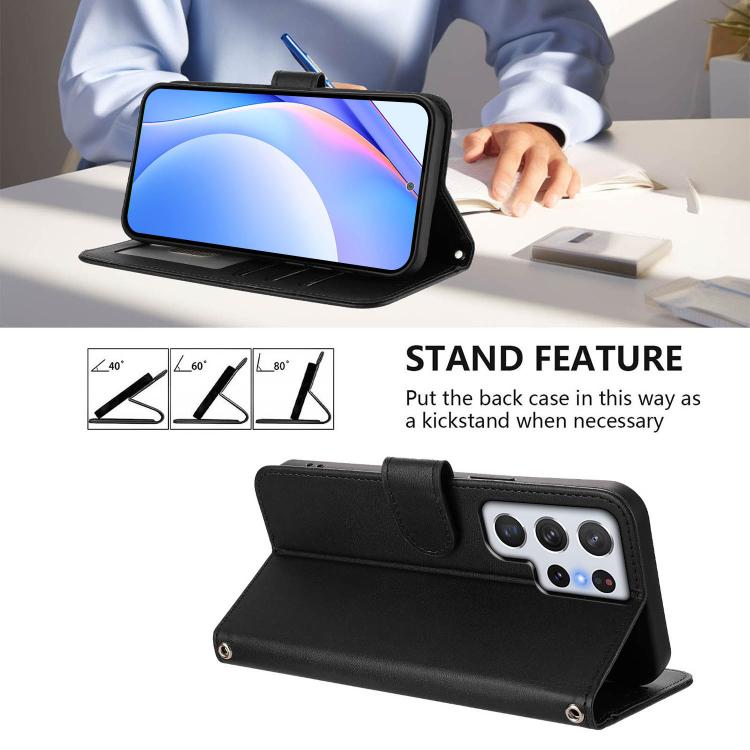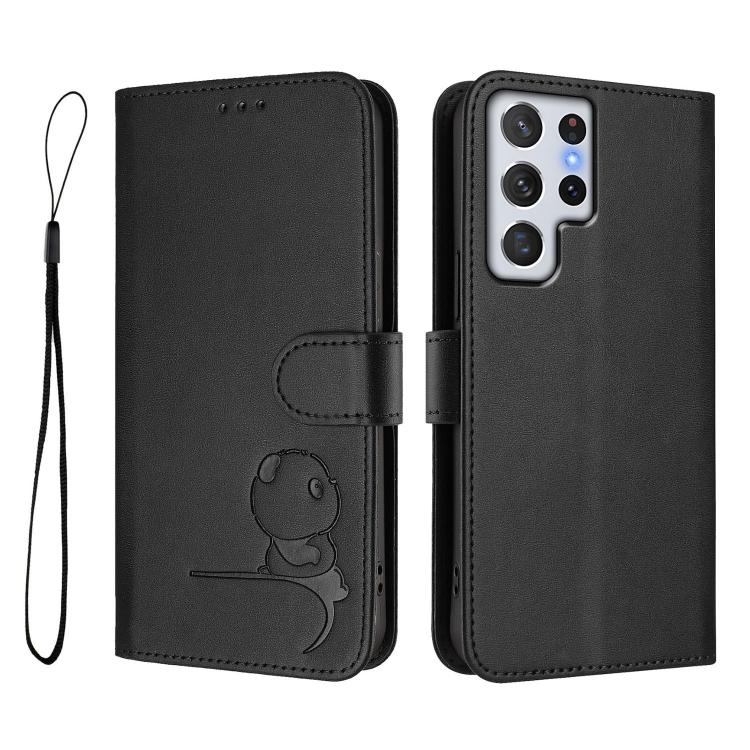 For Samsung Galaxy S22 Ultra 5G Litter Panda Embossing RFID Leather Phone Case with Lanyard(Black)