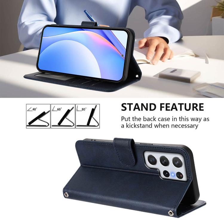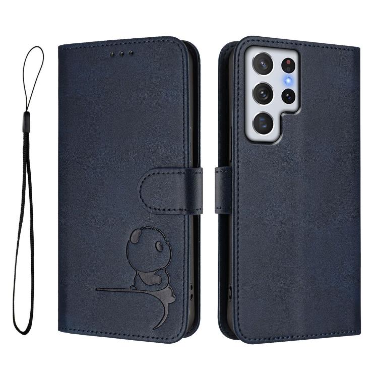 For Samsung Galaxy S22 Ultra 5G Litter Panda Embossing RFID Leather Phone Case with Lanyard(Blue)