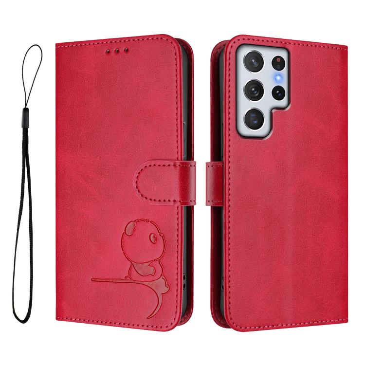 For Samsung Galaxy S22 Ultra 5G Litter Panda Embossing RFID Leather Phone Case with Lanyard(Rose Red)