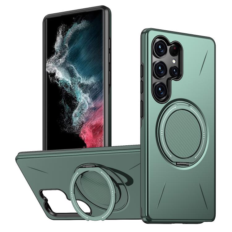 For Samsung Galaxy S22 Ultra 5G Metal Rotation Holder MagSafe TPU Hybrid PC Phone Case(Grey Green)