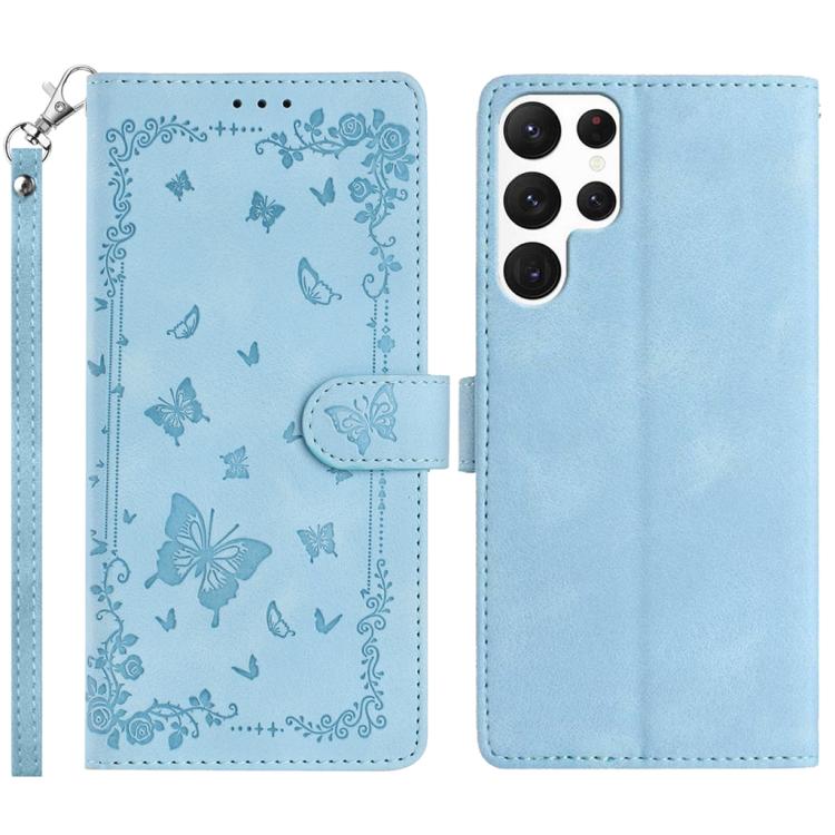 For Samsung Galaxy S22 Ultra 5G Secret Garden Butterfly Pattern Leather Phone Case(Blue)