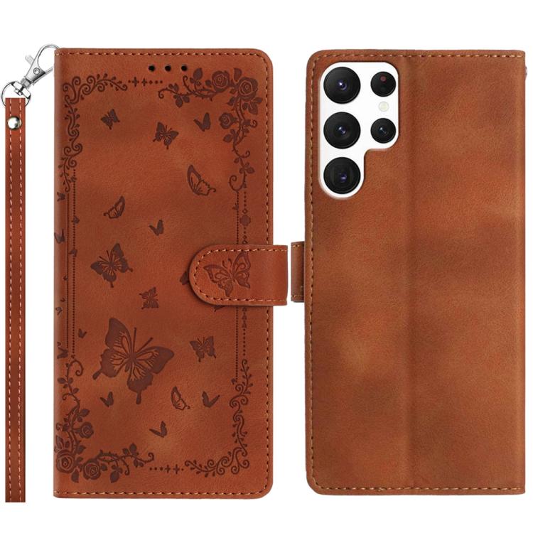 For Samsung Galaxy S22 Ultra 5G Secret Garden Butterfly Pattern Leather Phone Case(Brown)