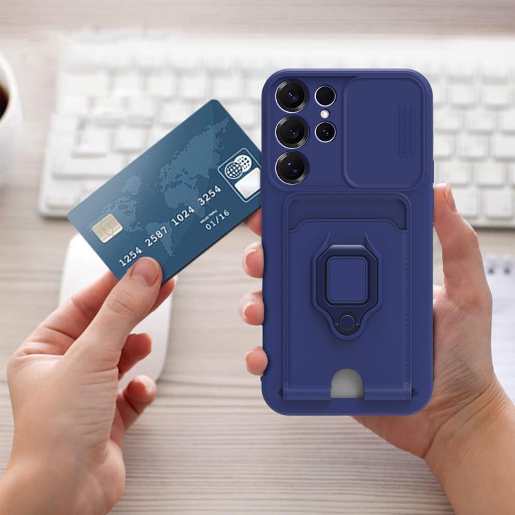 For Samsung Galaxy S22 Ultra 5G Sliding Camshield Magnetic Card Holder Silicone Phone Case with Lanyard(Pink)