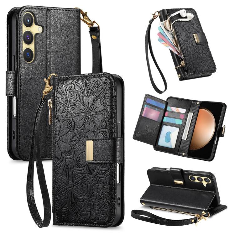 For Samsung Galaxy S23 FE 5G Flowers Leaves Zipper Wallet Leather Phone Case with Strap(Black)