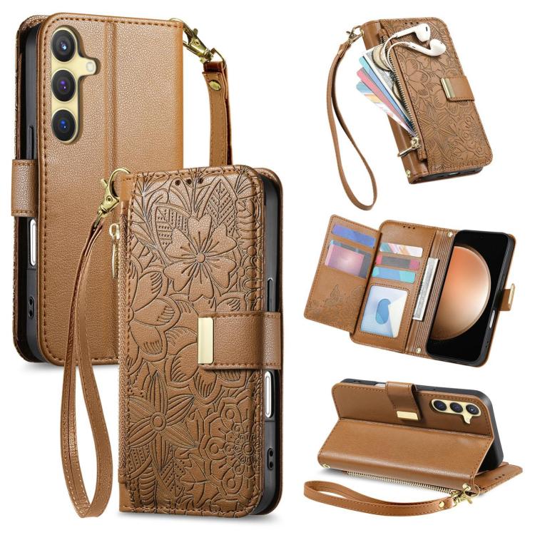 For Samsung Galaxy S23 FE 5G Flowers Leaves Zipper Wallet Leather Phone Case with Strap(Brown)