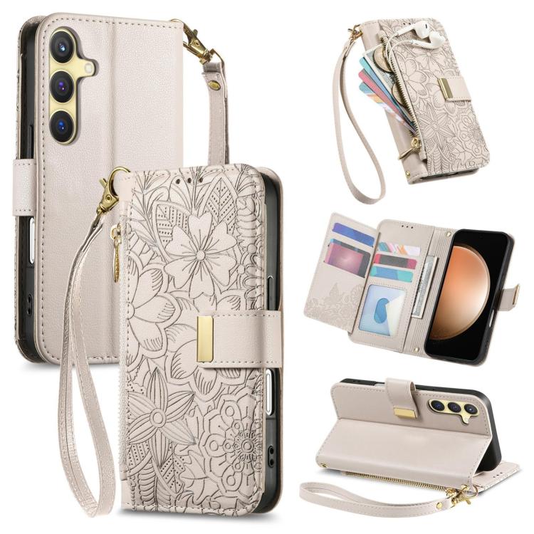 For Samsung Galaxy S23 FE 5G Flowers Leaves Zipper Wallet Leather Phone Case with Strap(Khaki)