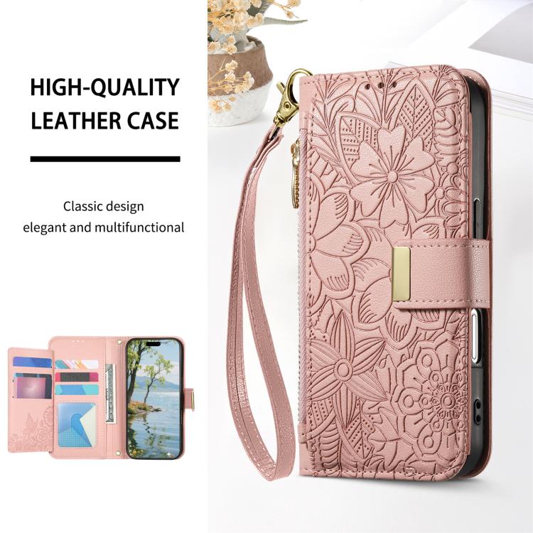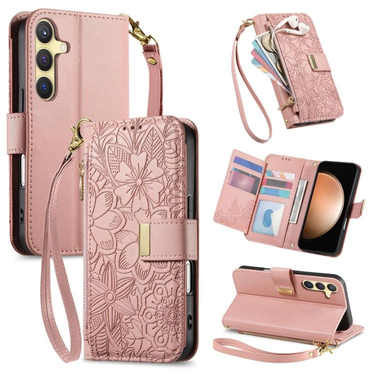 For Samsung Galaxy S23 FE 5G Flowers Leaves Zipper Wallet Leather Phone Case with Strap(Pink)