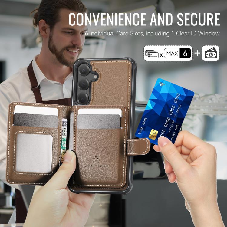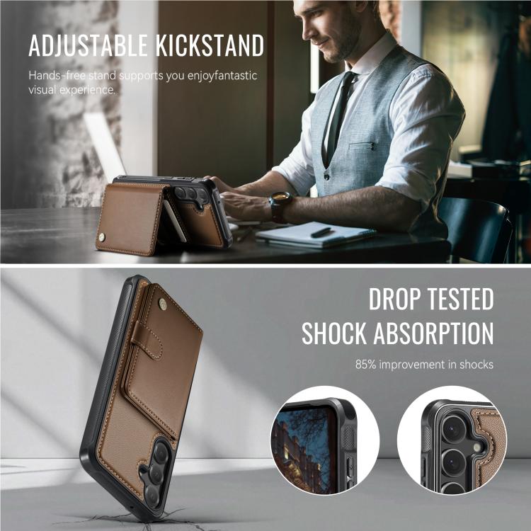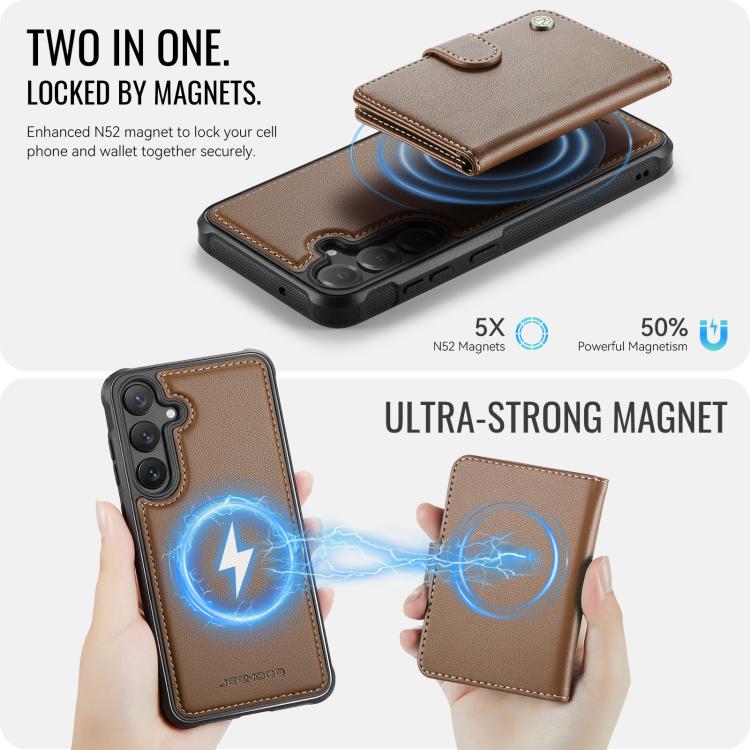 For Samsung Galaxy S23 FE 5G JEEHOOD J09 Buckle Card Bag MagSafe Magnetic Style RFID Leather Phone Case(Brown)