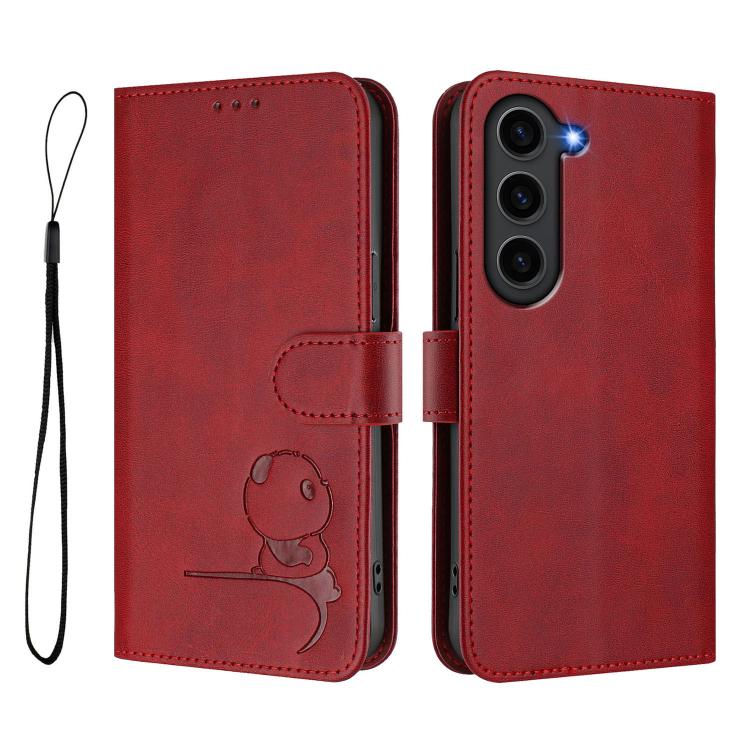 For Samsung Galaxy S23 FE 5G Litter Panda Embossing RFID Leather Phone Case with Lanyard(Wine Red)