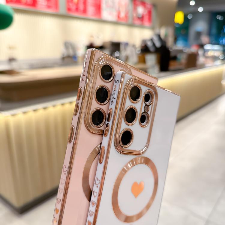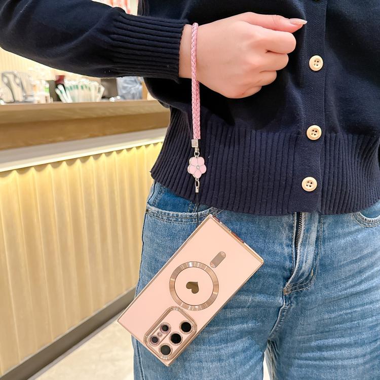 For Samsung Galaxy S23 FE 5G Pupil Side Heart MagSafe Electroplating Phone Case with Lanyard(Pink)
