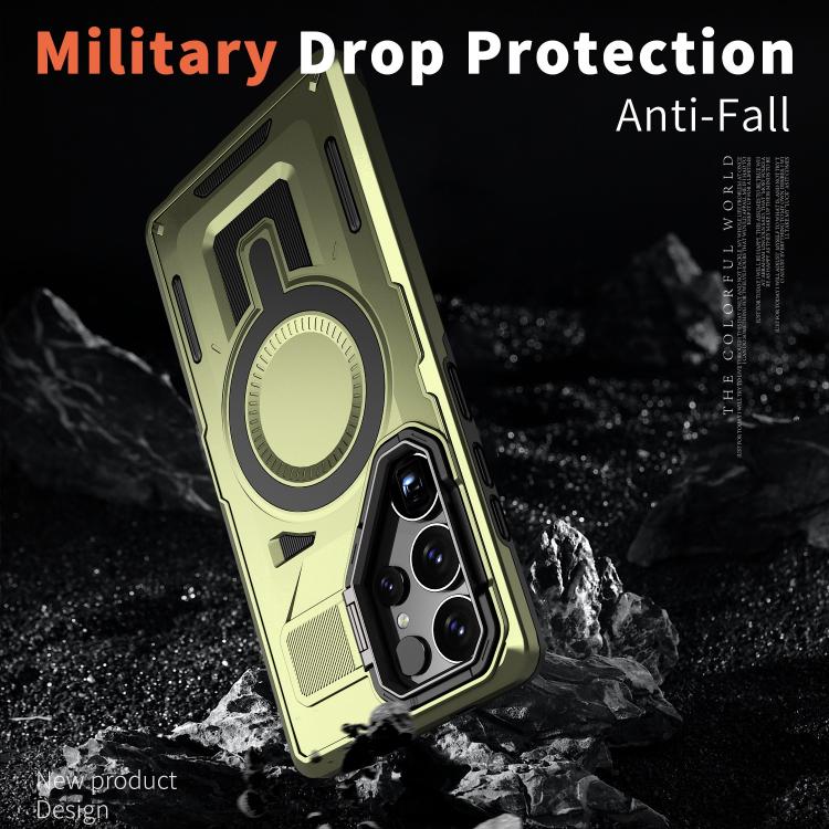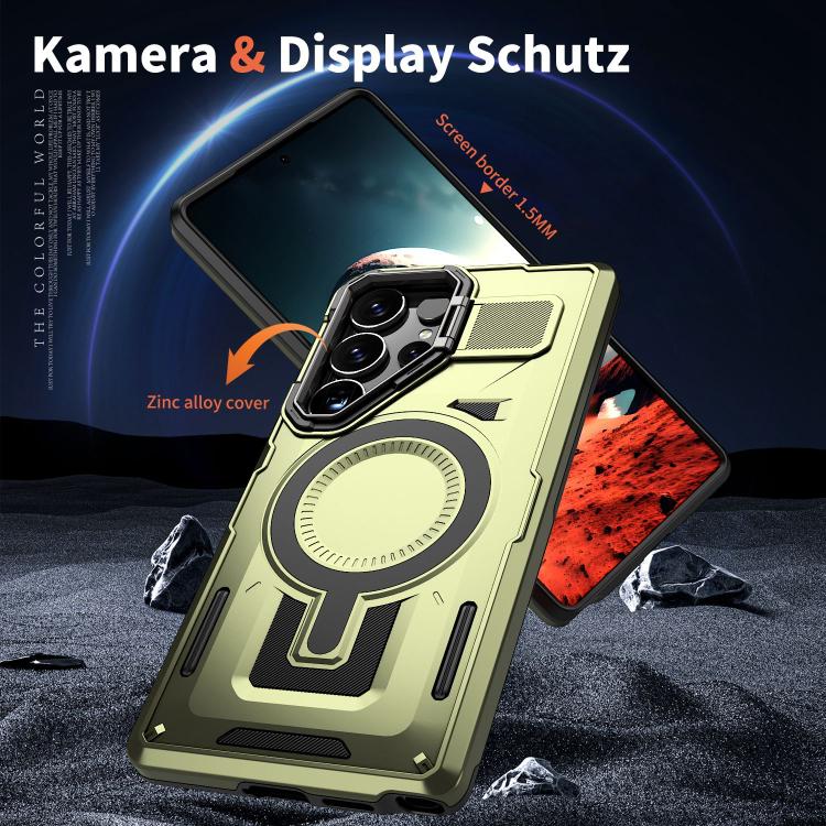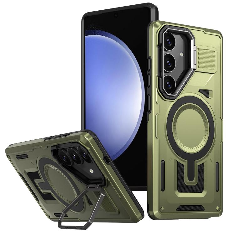 For Samsung Galaxy S23 FE 5G Shield Hollow Frame Holder MagSafe Phone Case(Olive Green)