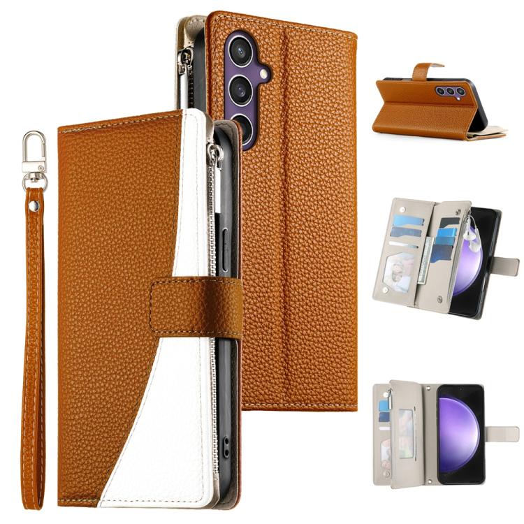 For Samsung Galaxy S23 FE 5G Stitching Multi-card Zipper Wallet Leather Phone Case with Short Strap(Brown)