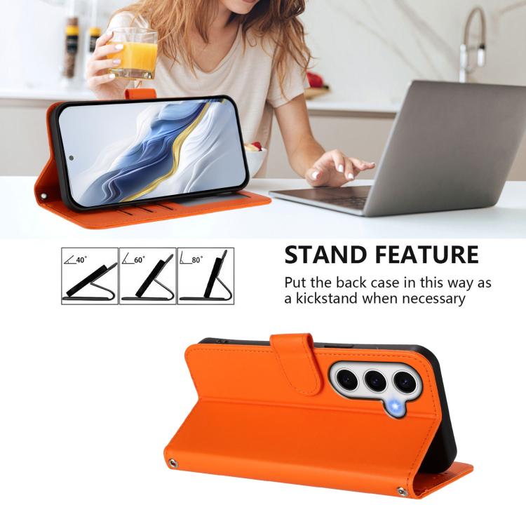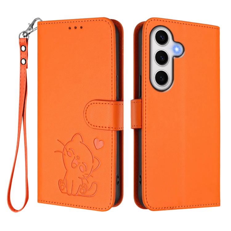 For Samsung Galaxy S24 FE 5G Embossed Heart Cat Leather Phone Case with Hand Strap(Orange)