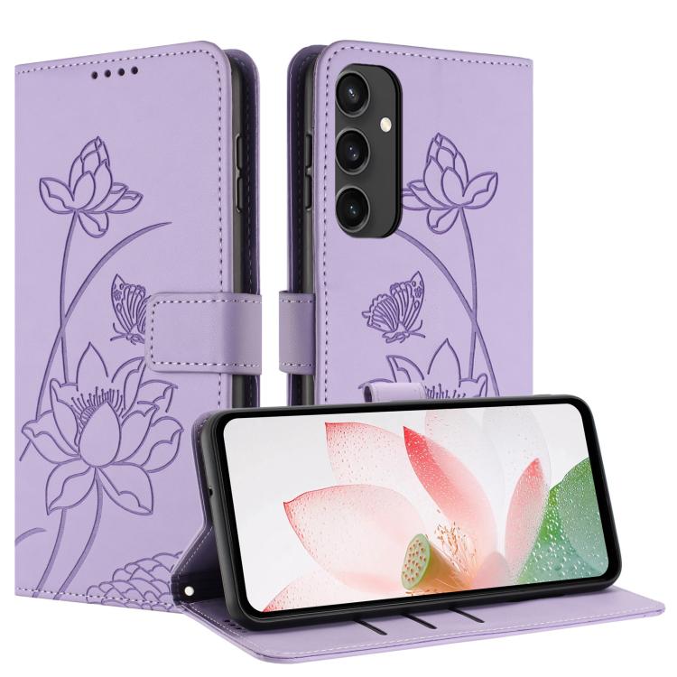 For Samsung Galaxy S24 FE 5G Lotus Embossed Leather Phone Case with Lanyard(Purple)
