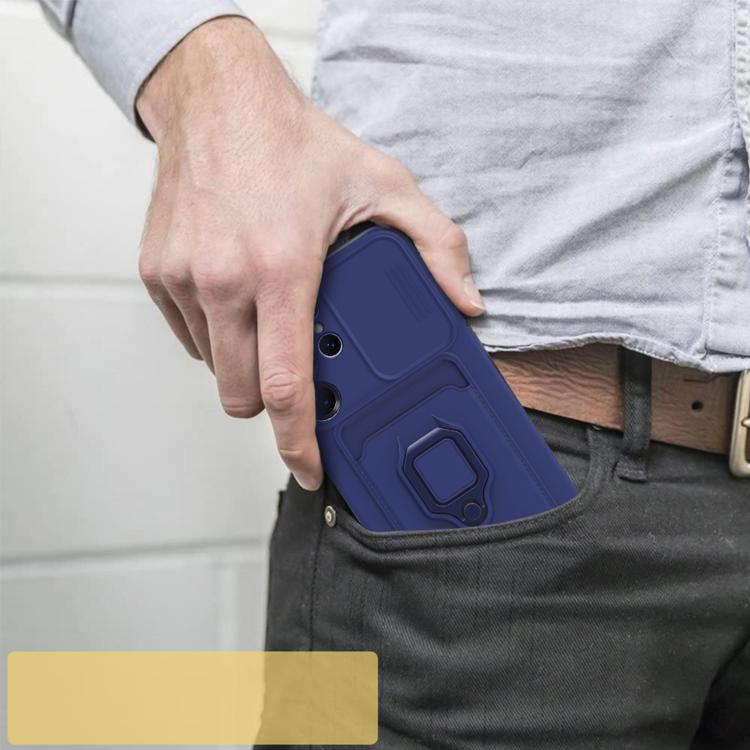For Samsung Galaxy S24 FE 5G Sliding Camshield Magnetic Card Holder Silicone Phone Case with Lanyard(Pink)