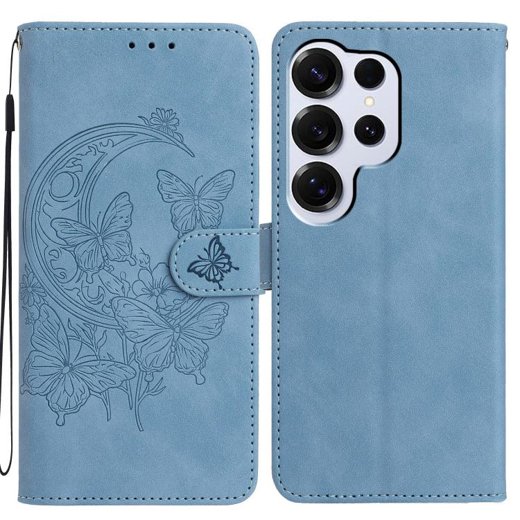 For Samsung Galaxy S26 Ultra 5G Moonlit Butterfly Dance Pattern Embossed Leather Phone Case(Blue)