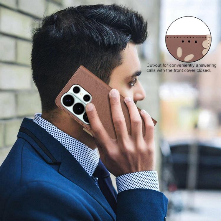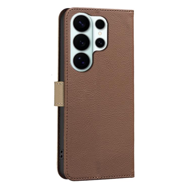 For Samsung Galaxy S26 Ultra 5G Splicing Color Hollow Flower Pattern RFID Leather Phone Case(Brown)