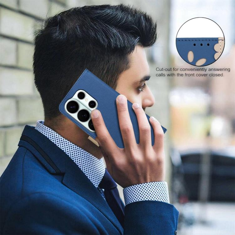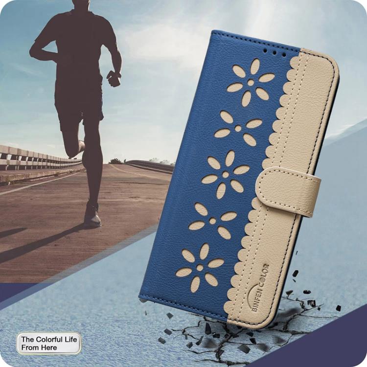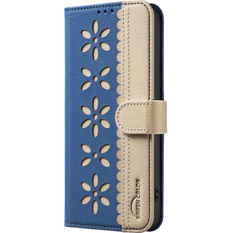 For Samsung Galaxy S26 Ultra 5G Splicing Color Hollow Flower Pattern RFID Leather Phone Case(Dark Blue)