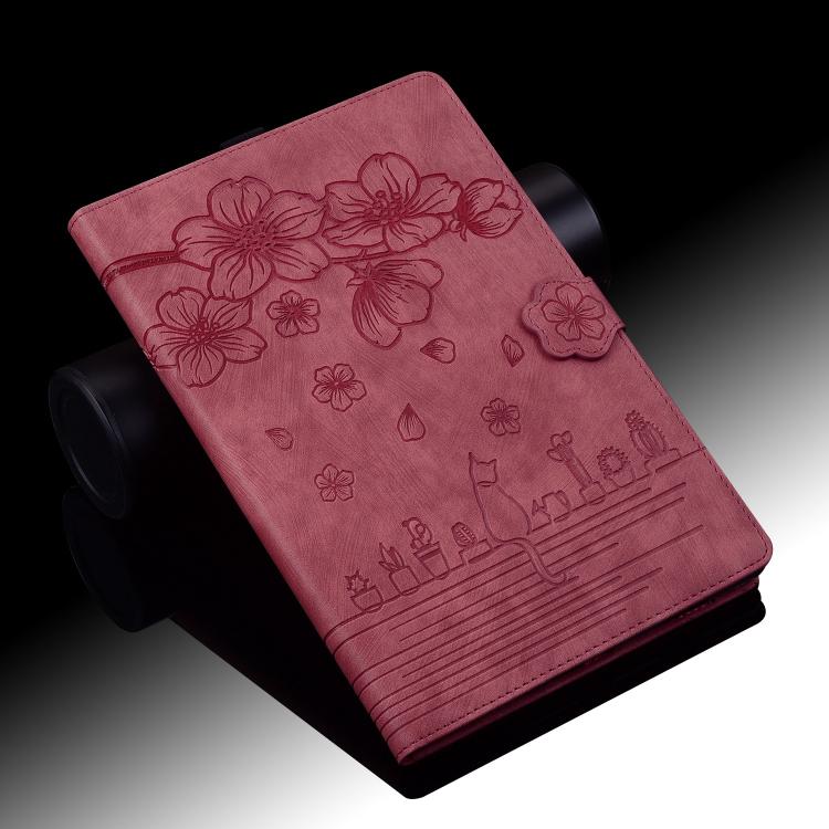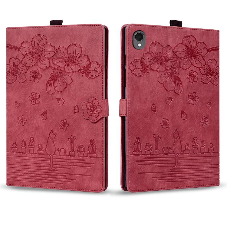 For Samsung Galaxy Tab S11 Cartoon Sakura Cat Embossed Smart Leather Tablet Case(Red)