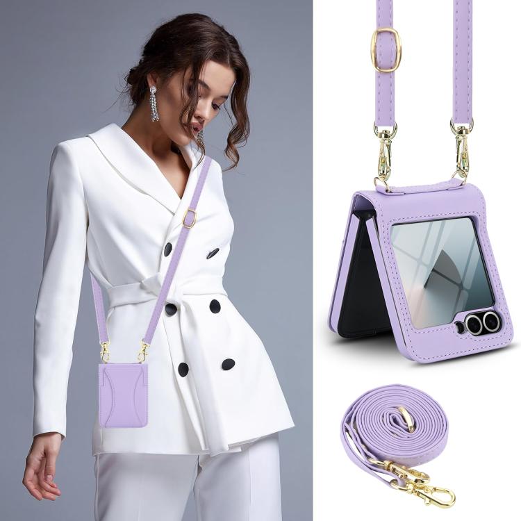 For Samsung Galaxy Z Flip5 Integrated Fold Holder Card Slot Phone Case with Long & Short Lanyard(Purple)