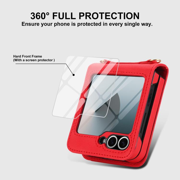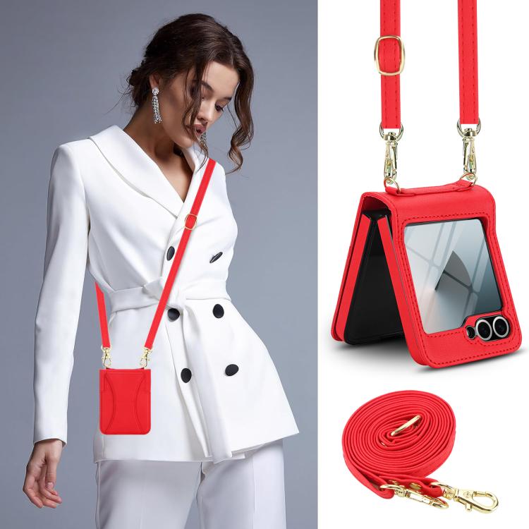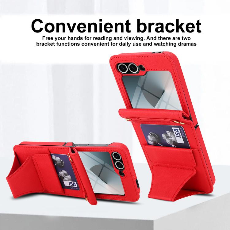 For Samsung Galaxy Z Flip5 Integrated Fold Holder Card Slot Phone Case with Long & Short Lanyard(Red)
