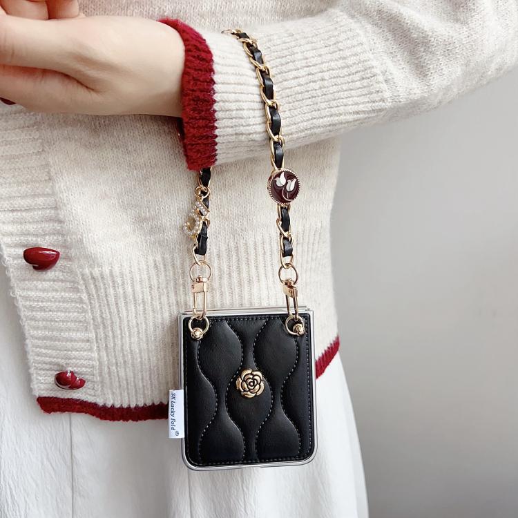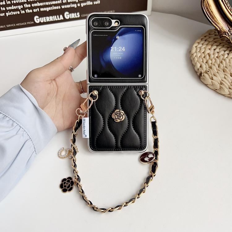 For Samsung Galaxy Z Flip5 Puffer Jacket 3D Camellia Pattern Phone Case with Wrist Strap(Black)