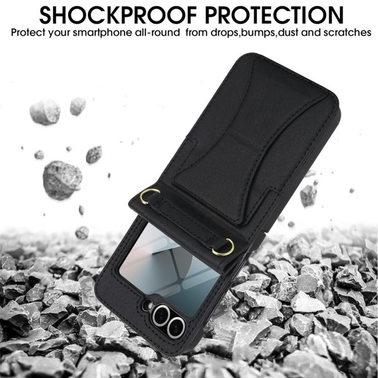 For Samsung Galaxy Z Flip6 / Flip7 FE Integrated Fold Holder Card Slot Phone Case with Long & Short Lanyard(Black)