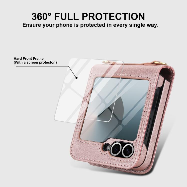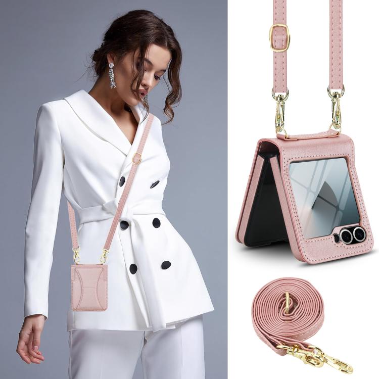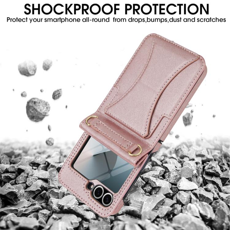 For Samsung Galaxy Z Flip6 / Flip7 FE Integrated Fold Holder Card Slot Phone Case with Long & Short Lanyard(Rose Gold)