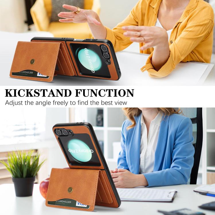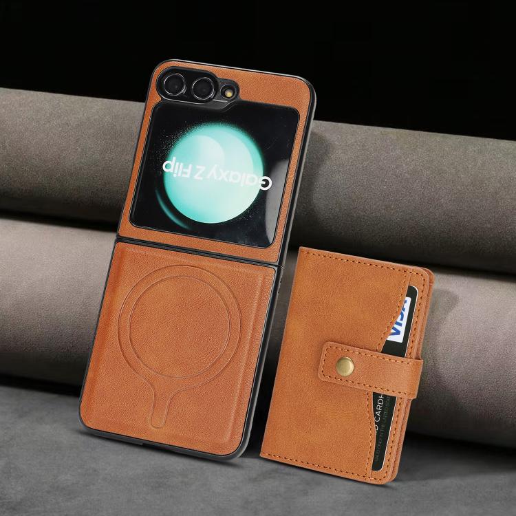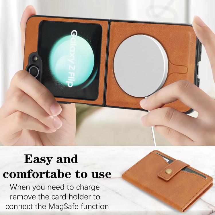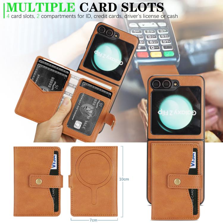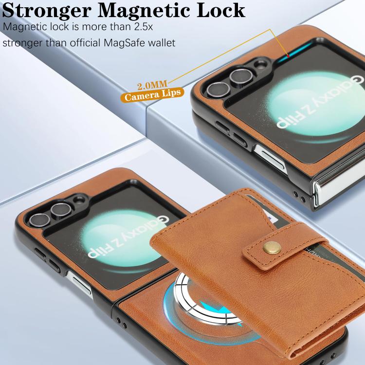 For Samsung Galaxy Z Flip6 / Flip7 FE Kalebol Magnetic Button Card Bag MagSafe Ring Leather Phone Case(Brown)
