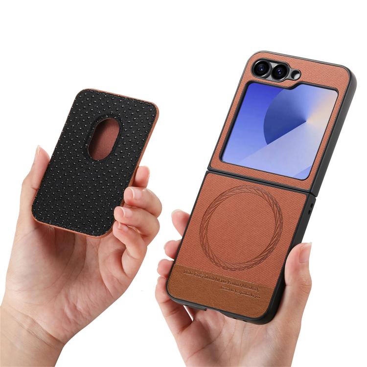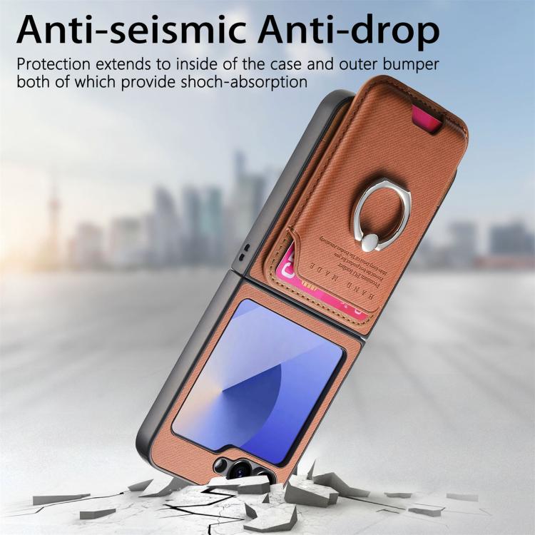 For Samsung Galaxy Z Flip6 / Flip7 FE Twill Fabric Card Bag Ring Magnetic Back Phone Case(Brown)