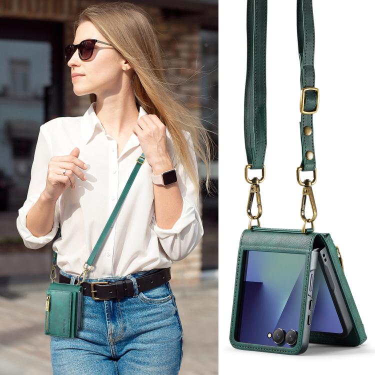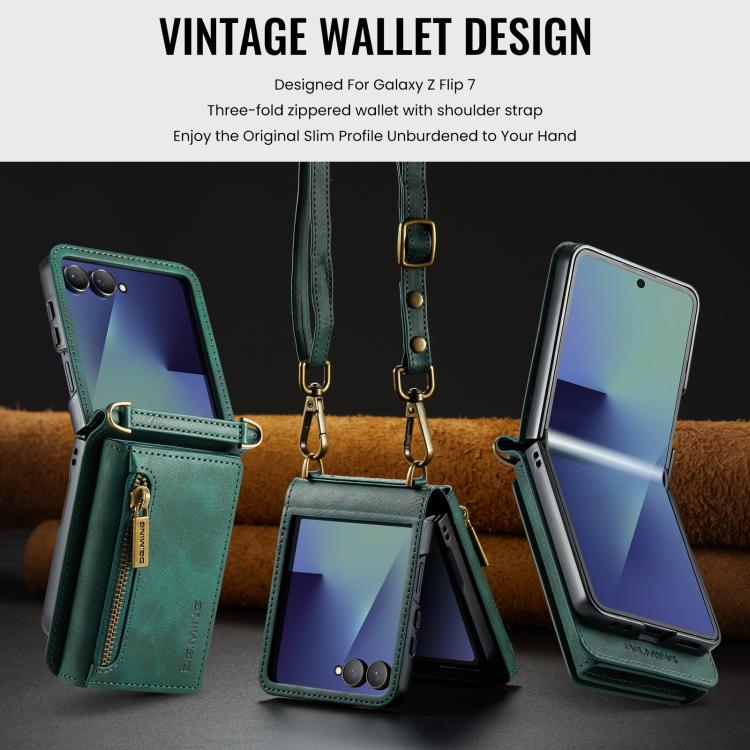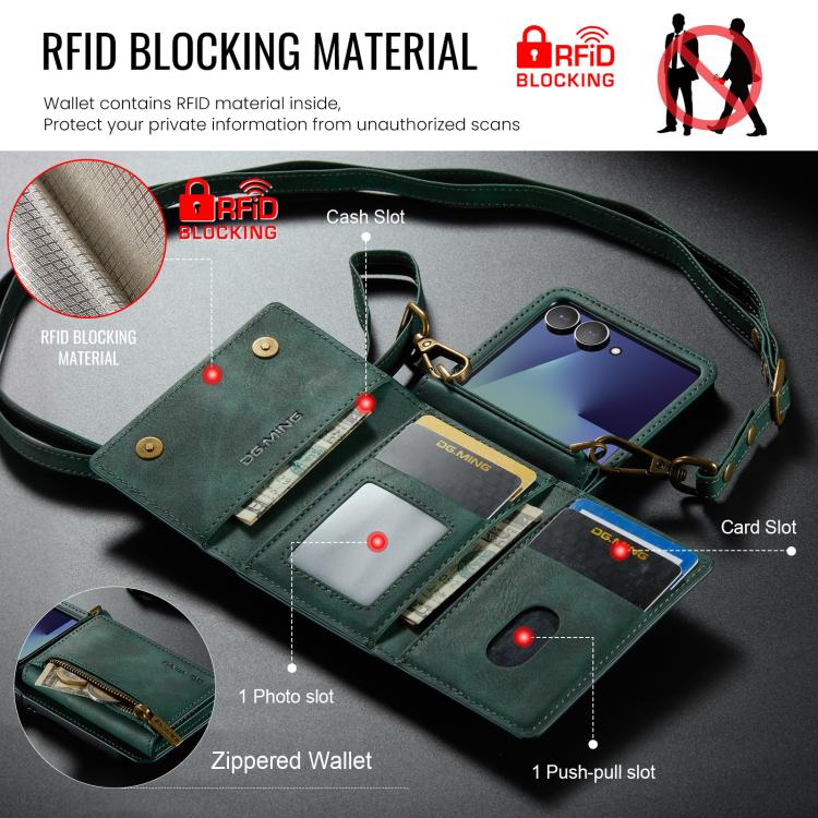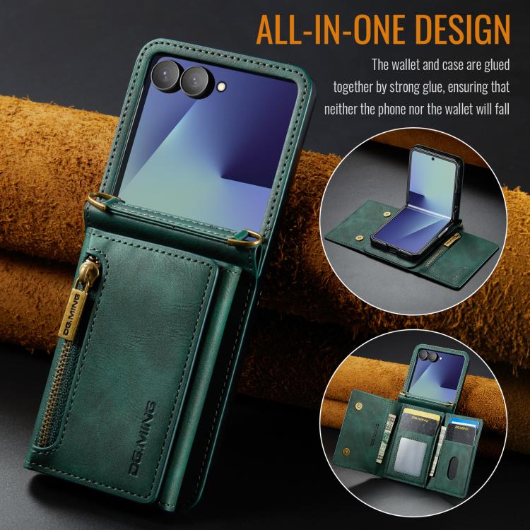 For Samsung Galaxy Z Flip7 5G DG.MING M5 Series Zip RFID Multi Card Detachable Leather Phone Case with Long Lanyard(Green)
