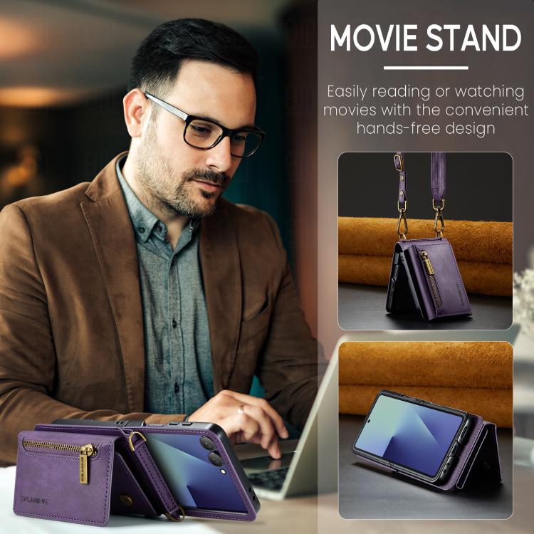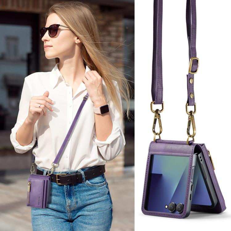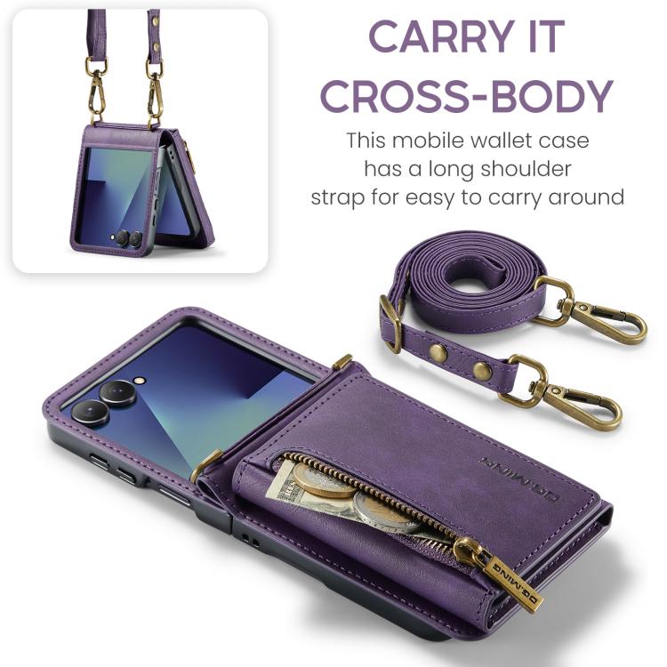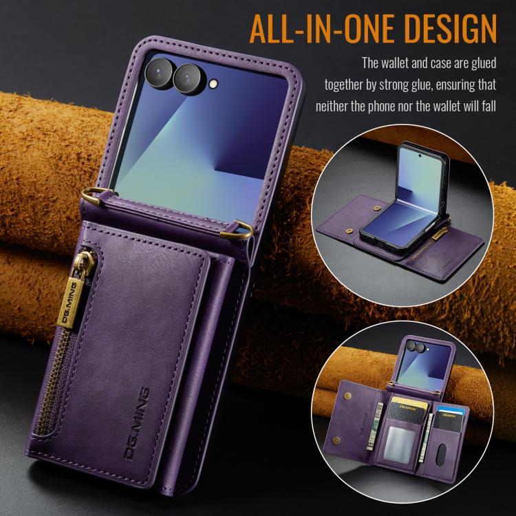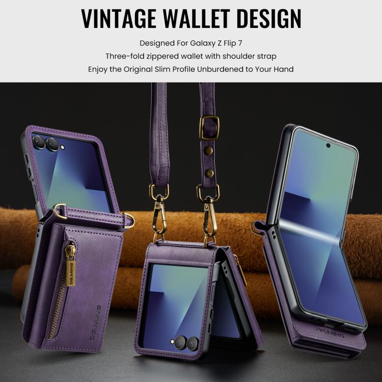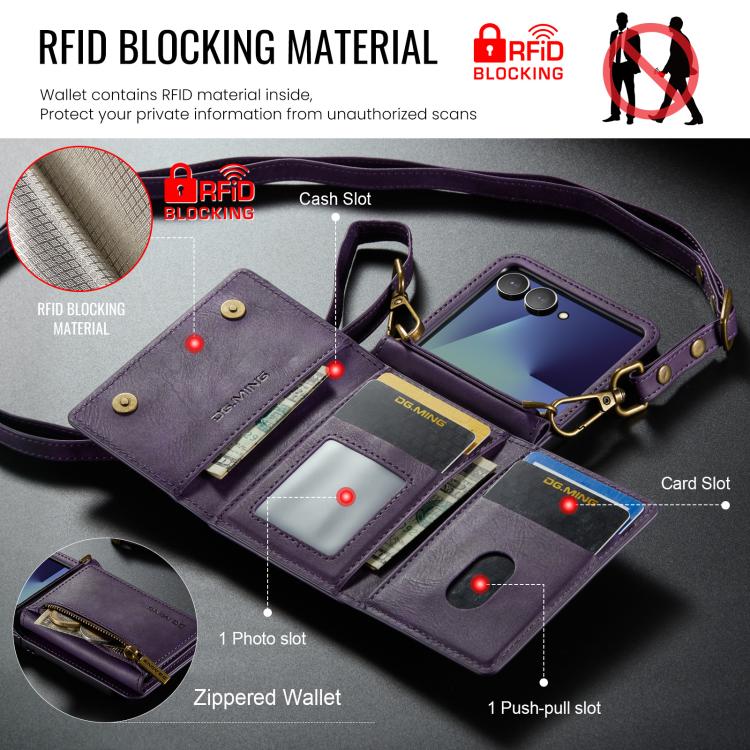 For Samsung Galaxy Z Flip7 5G DG.MING M5 Series Zip RFID Multi Card Detachable Leather Phone Case with Long Lanyard(Purple)