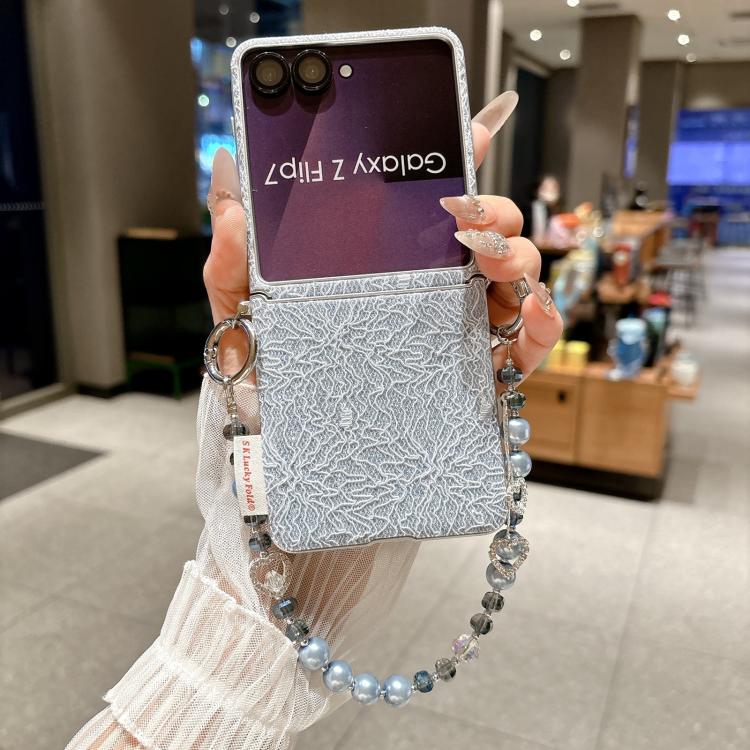 For Samsung Galaxy Z Flip7 5G Dual Side Metal Hooks Lace Embossed Phone Case with Wrist Strap(Blue)