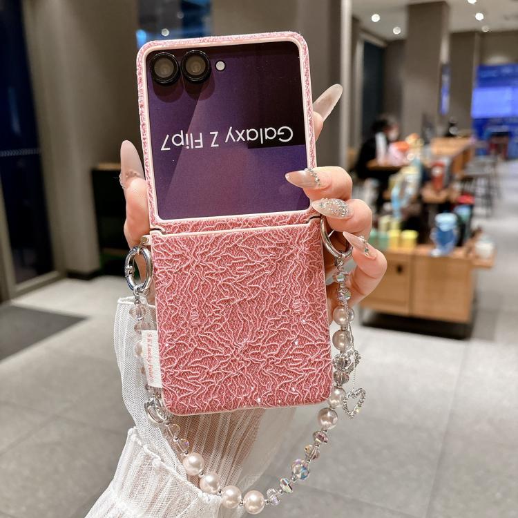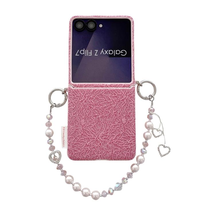 For Samsung Galaxy Z Flip7 5G Dual Side Metal Hooks Lace Embossed Phone Case with Wrist Strap(Pink)